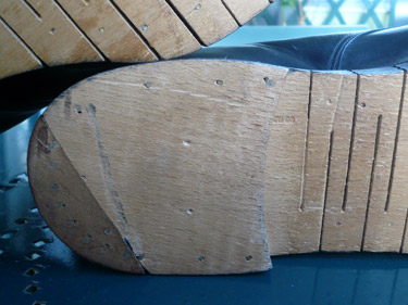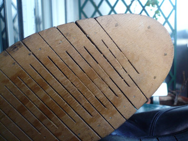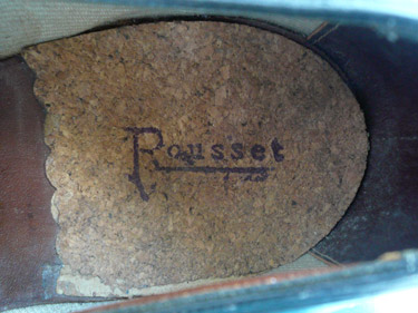 Cette paire de Derby de la manufacture blésoise Rousset a été confectionnée durant l'Occupation : période au cours de laquelle les restrictions de cuir ont contraint les fabricants à réaliser des semelles articulées en bois.